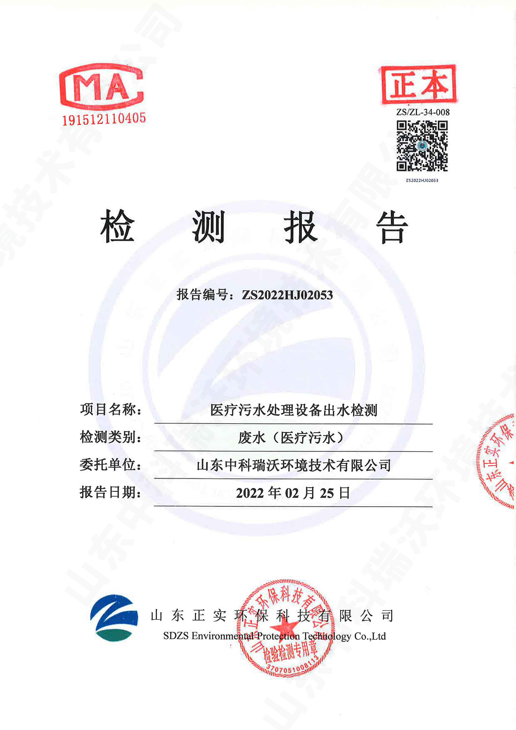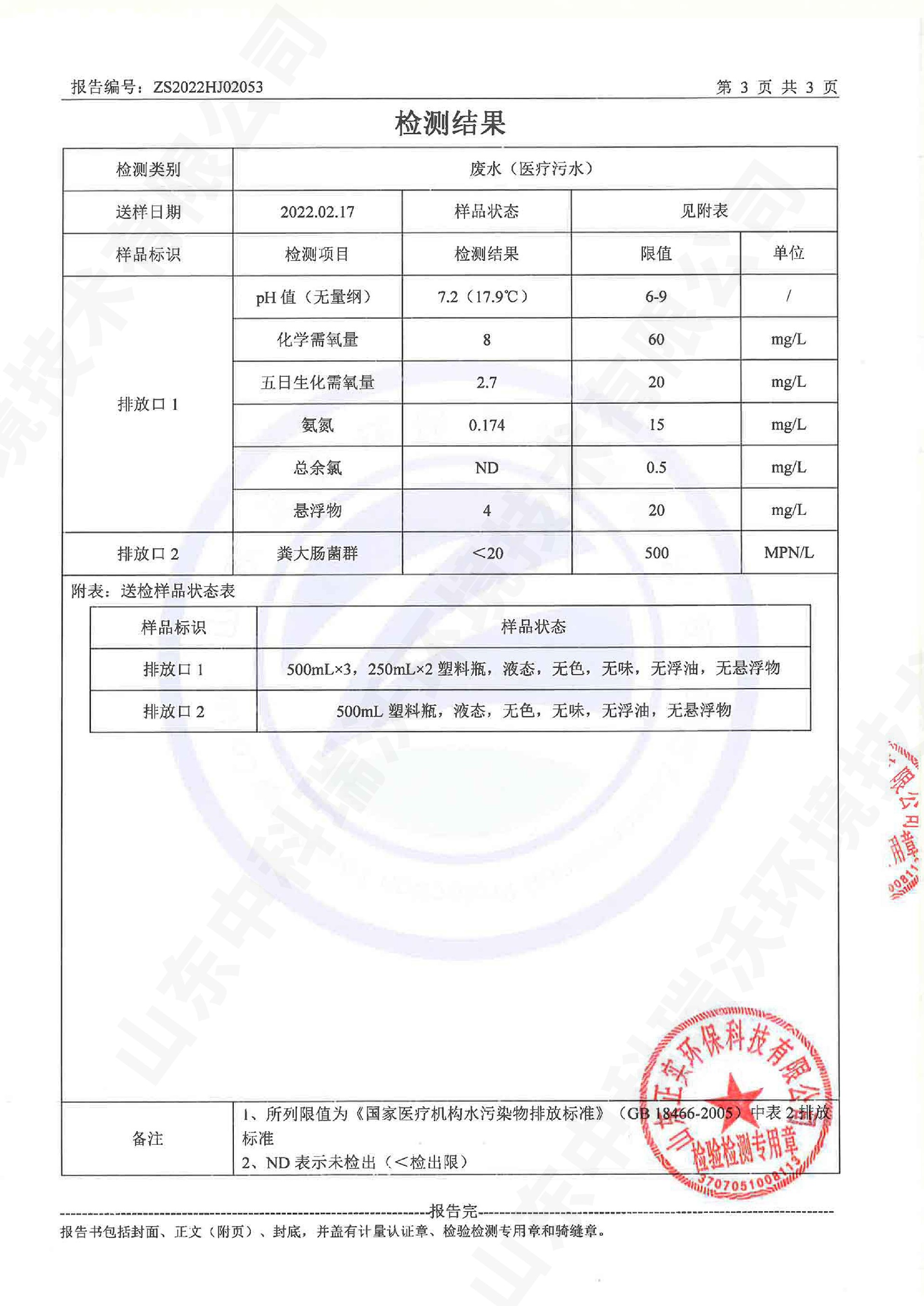 醫(yī)療污水處理設備出水檢測報告